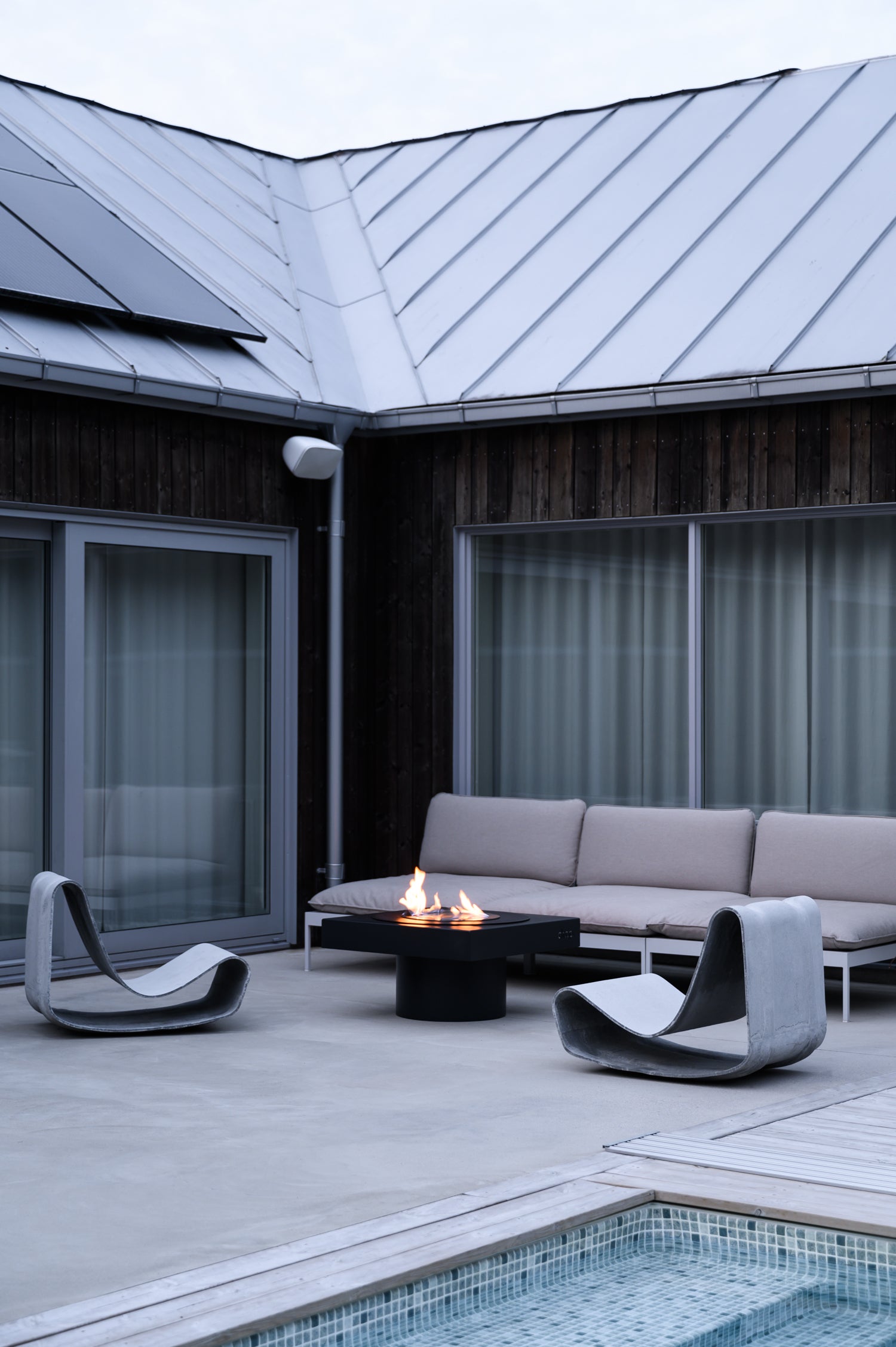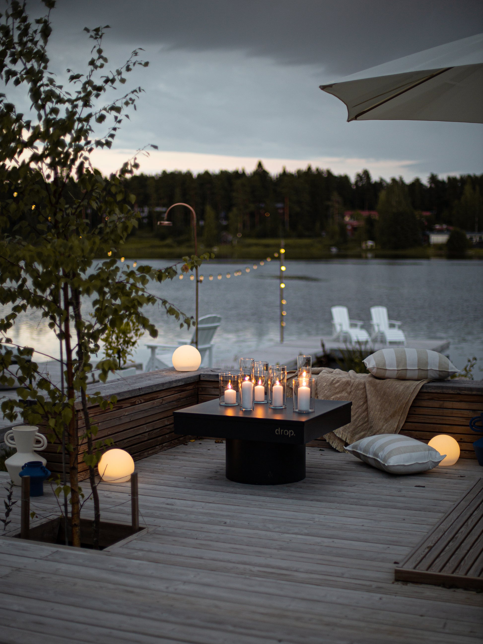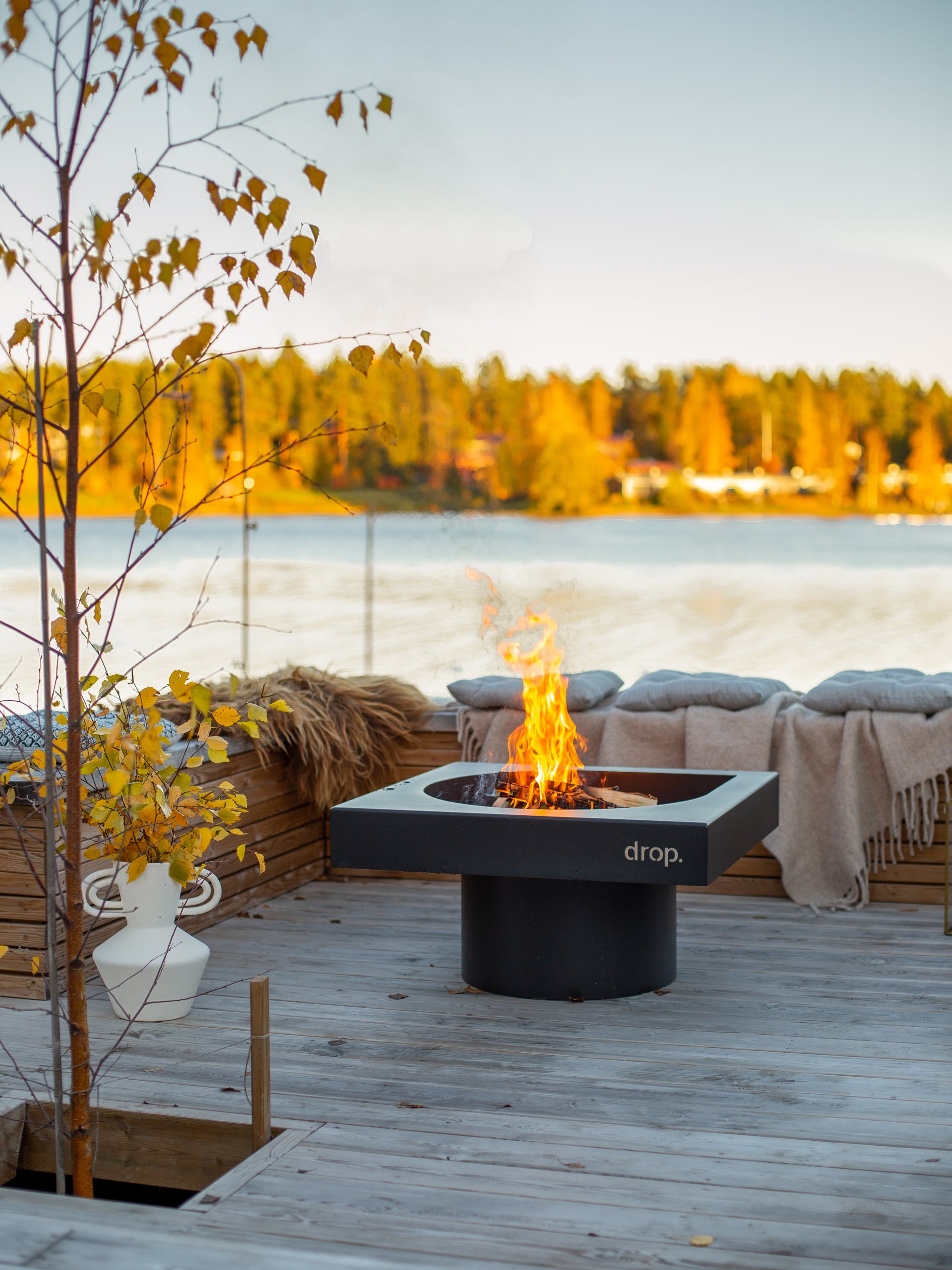 Drop Design Fire is a gorgeous design fireplace that follows the shape of the Drop spa pool, which is awarded with the Finnish Design Deed of the Year. The high-quality Design Fire, designed and handmade in Finland, is a true eye-catcher and an impressive design element for your patio or backyard. The fireplace is uniquely versatile and can be used outside with firewood or coal. The Design Fire comes with a square-shaped black cover that transforms the fireplace into a table and keeps water and trash away when the fireplace is not in use.